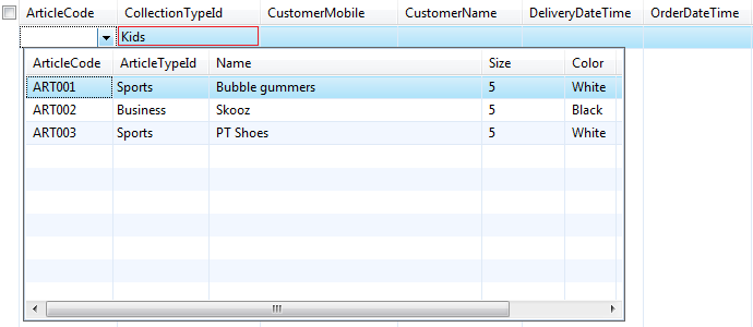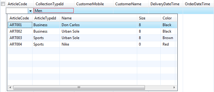 You can see in the picture how three relations have been defined. Each relation contains two fields, one used for determining the collection type and the other mapping to the respective collection’s Article Code field. Once all this is done, then now the system filters records for the user depending on the collection type the user has selected. See below how the system shows records from the men’s collection when CollectionType is set to ‘Men’:
