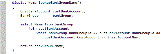 If we need to show CustTable.AccountNum, DirPartyTable.Name and BankGroup.Name fields on the same control let’s say a grid control then we need to define the following display methods on CustTable if we have chosen CustTable as the grid’s datasource.