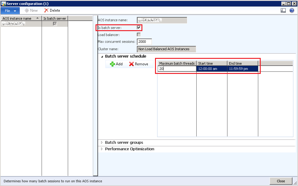 To configure an AOS instance as a batch server go to System Administration > Setup > System and open Server Configuration form. Select the AOS instance to configure from the grid on the left. Check Is batch server to specify this instance as a batch server. Expand the fast tab Batch Server Schedule. Mention the Maximum batch threads along with start and end times.