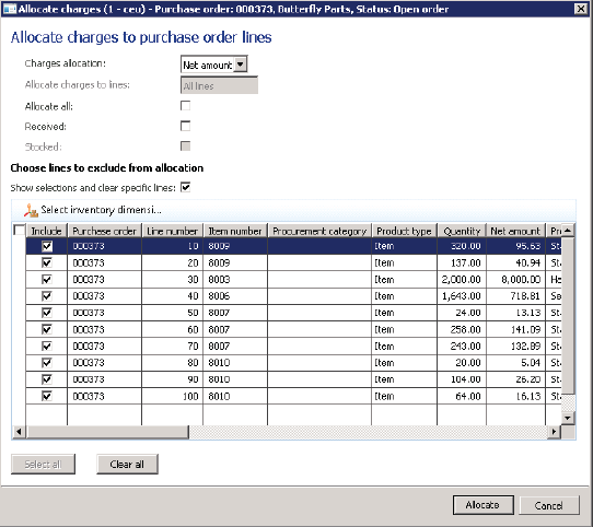 | Show selection and clear specific lines | Select to exclude specific lines from this allocation. This check box is not available if no charges are set up |