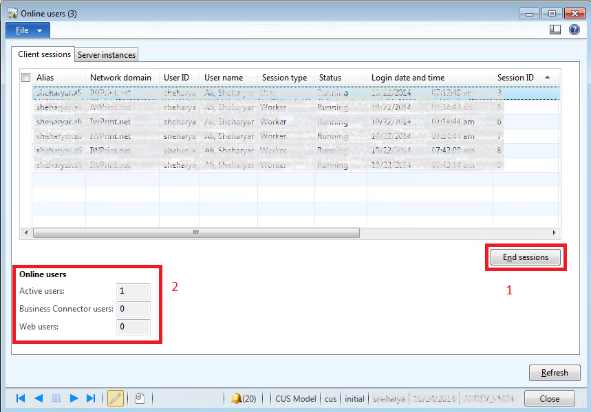 Further, we can also see existing server sessions to AOS server by querying SQL table SysServerSessions in which active sessions are identified by 1 in Status field: