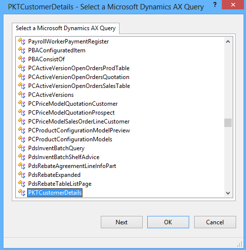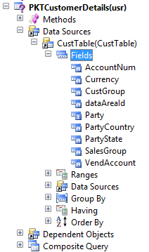 9. Set the Query property of the dataset to the newly created AOT Query PKTCustomerDetails.