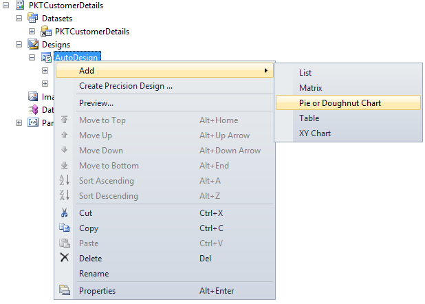 7. Right click the project node in the Solution Explorer, click Add > Report. Rename the report to PKTCustomerDetails.
