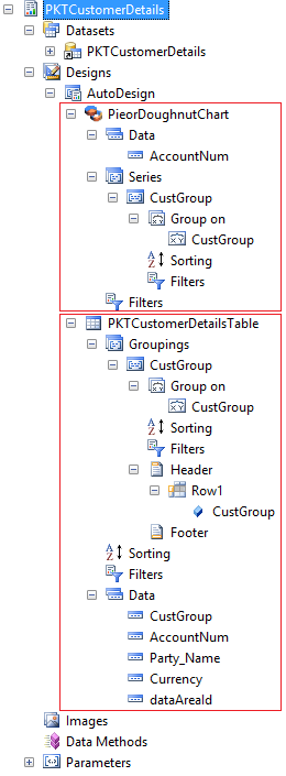 11. Drag the newly added dataset to the Designs node. This will automatically an AutoDesign to the report. Moreover a table will also be added for the dataset having all the fields in the Data node.