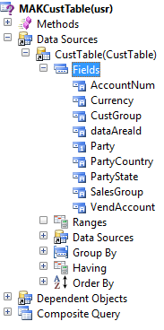 14. Now to add more report parameters, update the AOT query MAKCustTable to have the following ranges added: