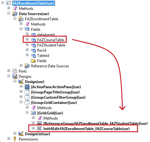6. Drag the FAZCourseTable field from the datasource to the grid control node.