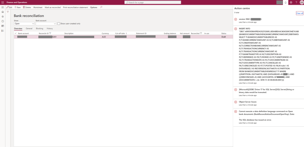 The purpose of this blog post is to demonstrate how can we resolve the error which surfaces when user tries to open the worksheet for a bank reconciliation.