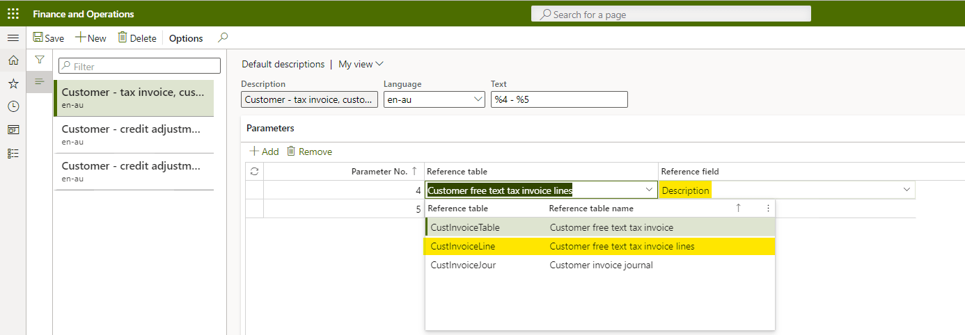Use customer free text invoice line description field in the definition of Customer – tax invoice, customer default description.